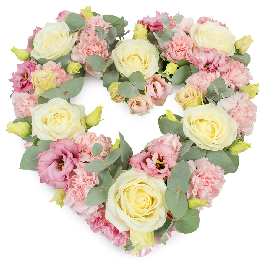 Delicately arranged, this open heart tribute will show perfectly how much you care and how grateful you are for knowing the dearly departed. It is created by the most elegant white roses, pink carnations, pink lisianthus and eucalyptus leaves.